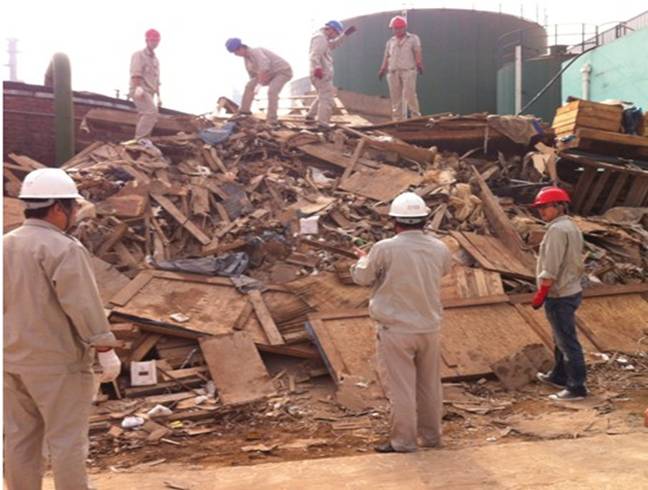 烈日炎炎,在公司總經理喬樹華號召下,由健康安全環保部經理孫長輝現場指揮,大家自行結隊,不畏辛苦,拆卸木箱、搬運木板、揀拾垃圾,將廢棄物重新規整,并對其進行分類,對能重新再利用的進行扎堆存放,對該遺棄的做集體堆放運出廠區。