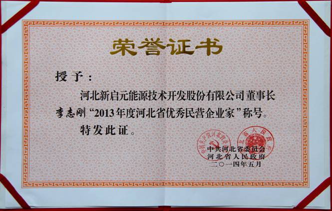 6月5日,中共河北省委、河北省人民政府授予新啟元公司“河北省2013年度百?gòu)?qiáng)民營(yíng)企業(yè)”榮譽(yù)稱號(hào)。授予新啟元公司董事長(zhǎng)李志剛“2013年度河北省優(yōu)秀民營(yíng)企業(yè)家”榮譽(yù)稱號(hào)。
