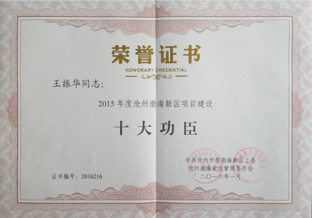 集團(tuán)董事長王振華同志獲得“2015年度滄州渤海新區(qū)項目建設(shè)十大功臣”榮譽稱號