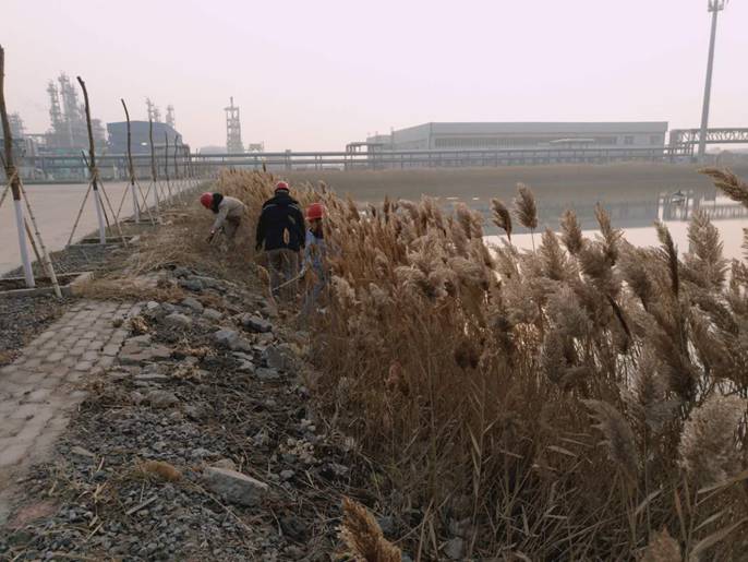 細問之下了解到,原來是運行六部的尾氣硫酸銨二班、水廠二班、污水二班的員工們看到景觀湖周圍干枯的蘆葦影響了公司整體環境的美觀,同時面臨氣候干燥的冬季容易成為火災隱患。為此,班長們主動溝通交流,利用休班時間自動自發的對景觀湖蘆葦進行清理。