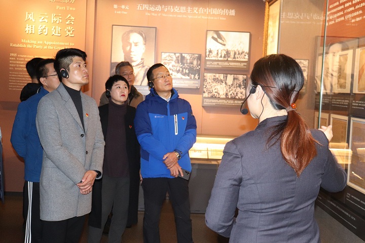 隨后在中共一大會址展覽廳,先后參觀了“前赴后繼、救亡圖存”、“風云際會、相約建黨”、“群英匯聚、開天辟地”等專題展區(qū)。各展區(qū)內陳列著中國共產黨的歷史文物、資料和革命志士的遺物、手跡,集中反映了中國共產黨早期開展革命活動、籌建中國共產黨的歷史脈絡。大家放慢腳步,駐足于歷史記錄痕跡前,表情肅穆且凝重,懷揣著敬仰之心,感受著共產黨人在革命發(fā)展中的擔當和初心,感悟著共產黨人在中國歷史上鐫刻的榮光和使命。