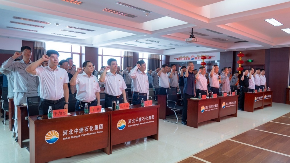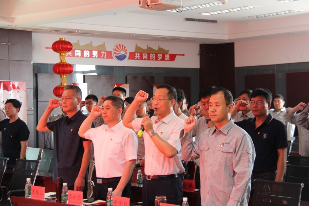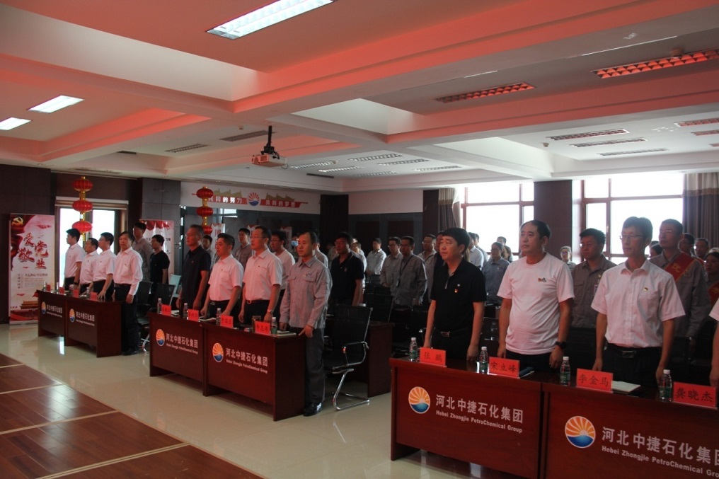 集團(tuán)黨委書記于國臣同志帶領(lǐng)全體參會人員共同重溫入黨誓詞,鏗鏘有力的宣誓聲縈繞在會場的每一個(gè)角落,讓中捷石化的全體黨員更加堅(jiān)定了“不忘初心、牢記使命”的共產(chǎn)黨人本色。
