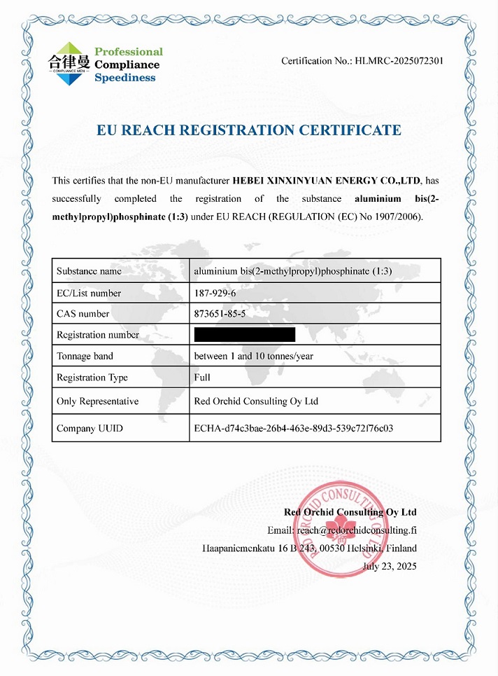 此次二異丁基次磷酸鋁產品REACH領頭注冊,不僅標志著新欣園公司成為全球首家獲得該產品歐盟市場準入資格的企業,更意味著向歐盟官方提交的新一代無鹵磷系阻燃劑的健康環保測試數據得到全部認可,充分驗證了該產品在性能指標、安全規范及環境友好性方面全面達到國際頂尖水準的核心競爭力,彰顯了企業在綠色材料創新與標準化建設方面的行業領導地位,顯著增強了新欣園公司在高端應用市場的競爭優勢,為全球合作伙伴提供了技術可靠、品質穩定的材料解決方案。